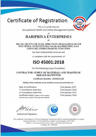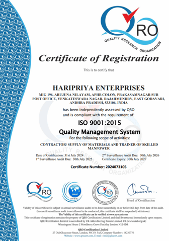 At HARI PRIYA, we are committed to delivering exceptional quality, ensuring a safe and healthy work environment, and minimizing our environmental footprint. To demonstrate our dedication to these principles, we have achieved certifications in three key international standards:
